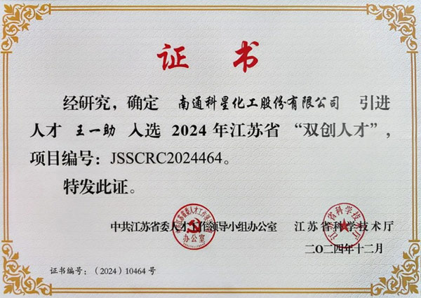 南通科星化工股份有限公司“植物基金屬加工液”項目領銜人王一助總工程師榮膺2024年江蘇省“雙創(chuàng)人才”稱號!