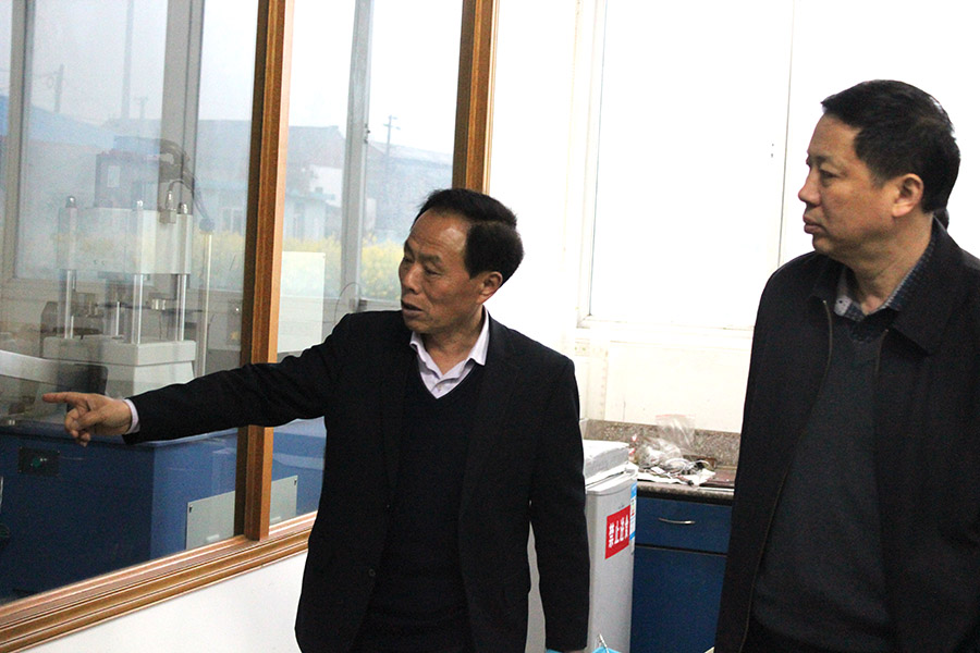 圖二 董事長(zhǎng)吳龍鐵向周秘書長(zhǎng)介紹各類研發(fā)、檢測(cè)設(shè)備
