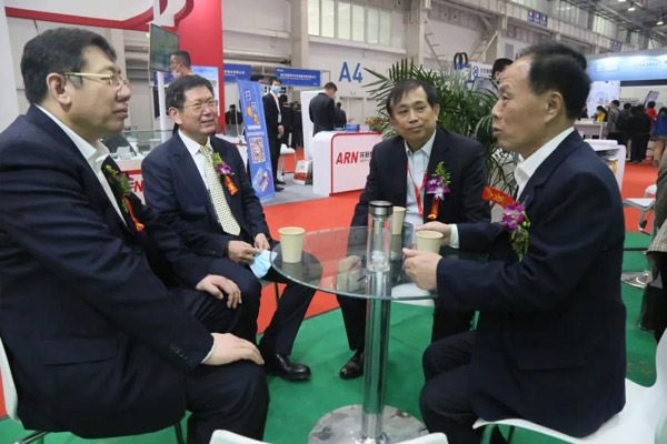 山東濰柴控股集團有限公司副總經(jīng)理佟德輝(左一)、中原內(nèi)配集團副總裁中原內(nèi)配股份有限公司總經(jīng)理黨增軍(左二)、中國內(nèi)燃機協(xié)會副秘書長孫奎崧(右二)蒞臨南通科星化工有限公司展位與董事長吳龍鐵(右一)愉快交談