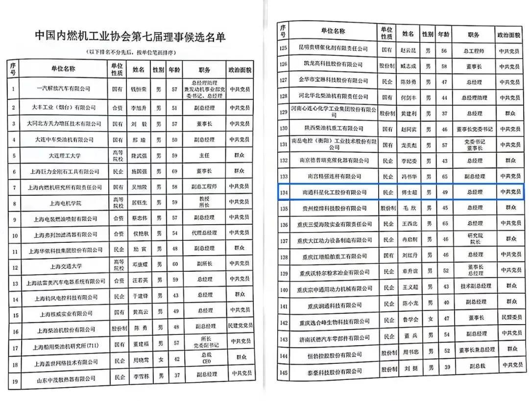 南通科星化工股份有限公司當選中國內燃機工業協會理事單位
