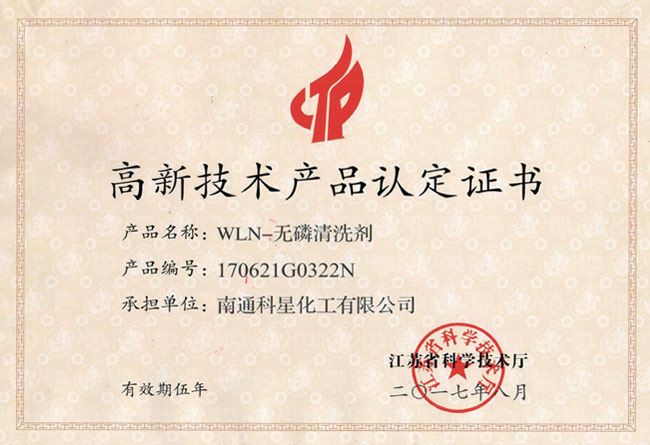 高新技術產品認定證書-WL-環保金屬表面處理劑